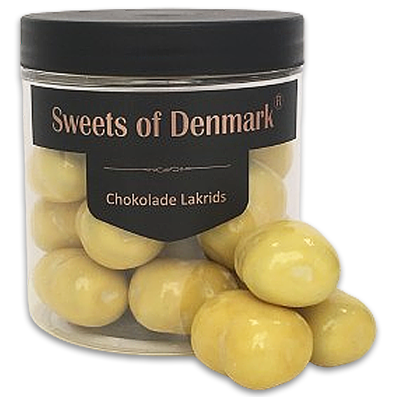 Salt lakrids overtrukket med hvid chokolade og med smag af citron
